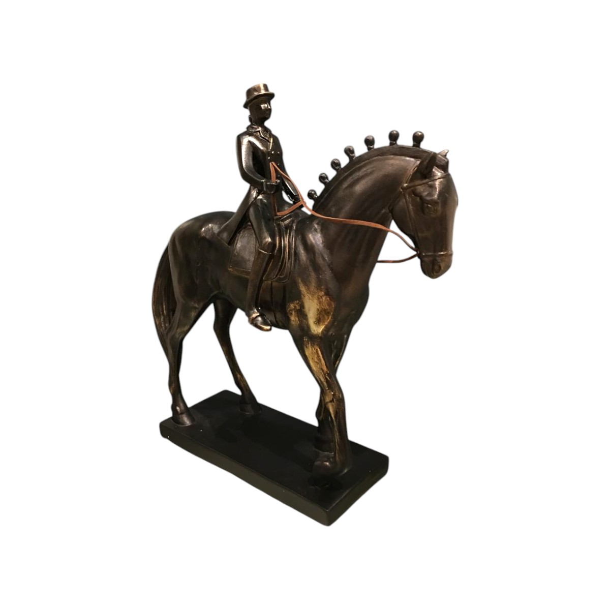Figura decorativa de hombre montando un caballo, elaborada en resina con un refinado acabado en marrón oscuro que resalta su elegancia y realismo. La escultura captura el dinamismo y la conexión entre jinete y caballo, transmitiendo fuerza, movimiento y equilibrio en cada detalle.