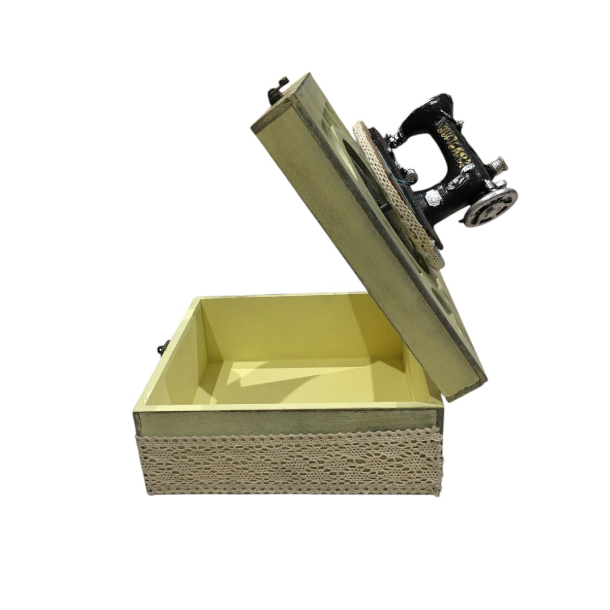 Caja musical de madera con máquina de coser