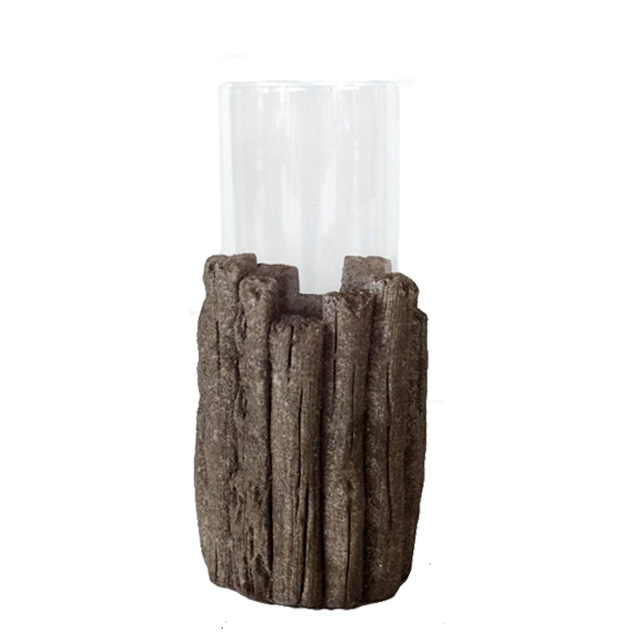 Su diseño incluye texturas que replican la corteza de un árbol, con detalles como grietas que realzan su aspecto orgánico. Está diseñada para sostener una vela, generando una iluminación cálida y tenue protegida por un frasco de vidrio que acentúa su encanto natural. Ideal para ambientes interiores y exteriores, es perfecto para quienes buscan una decoración inspirada en la naturaleza con un toque elegante.